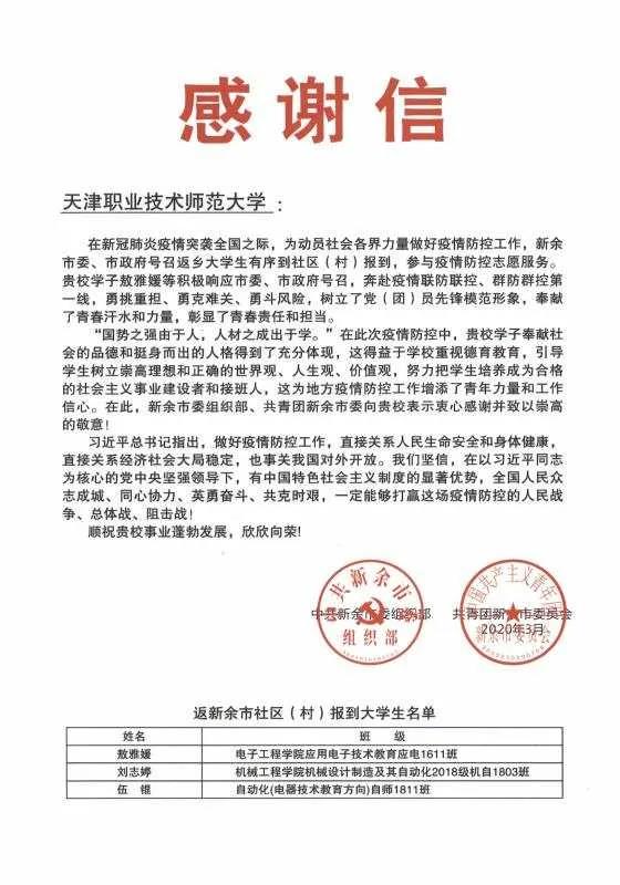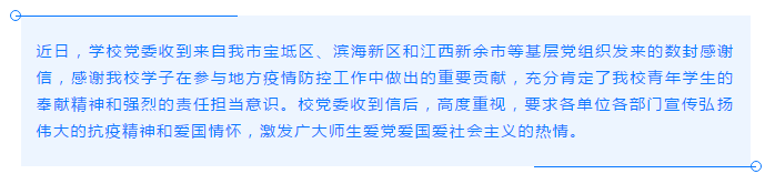 疫情无情人有情,感谢各位天职师大学子为抗击疫情做出的贡献,用实际行动诠释了青年担当,淬炼成钢,一封封表扬信,是对天职师大志愿者绽放战疫青春的莫大肯定,未来他们将继续与爱同行,用行动书写青春芳华。
