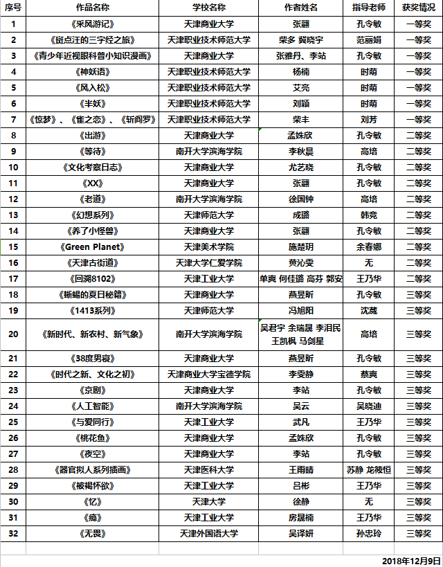 第五届天津市大学生原创动漫大赛漫画作品成绩
