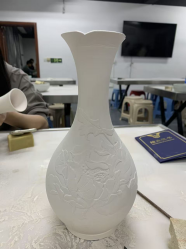 后期创作阶段,课程难度逐步提升。在釉上新彩绘制课程中,同学们牢记“颜色忌厚涂”的要点,从笔筒、瓷板等品类中任选两件完成作品;在大花瓶雕刻课上,同学们谨慎处理坯体,即便遇到坯体破损,也巧妙转化为艺术造型,展现了灵活的创作思维。