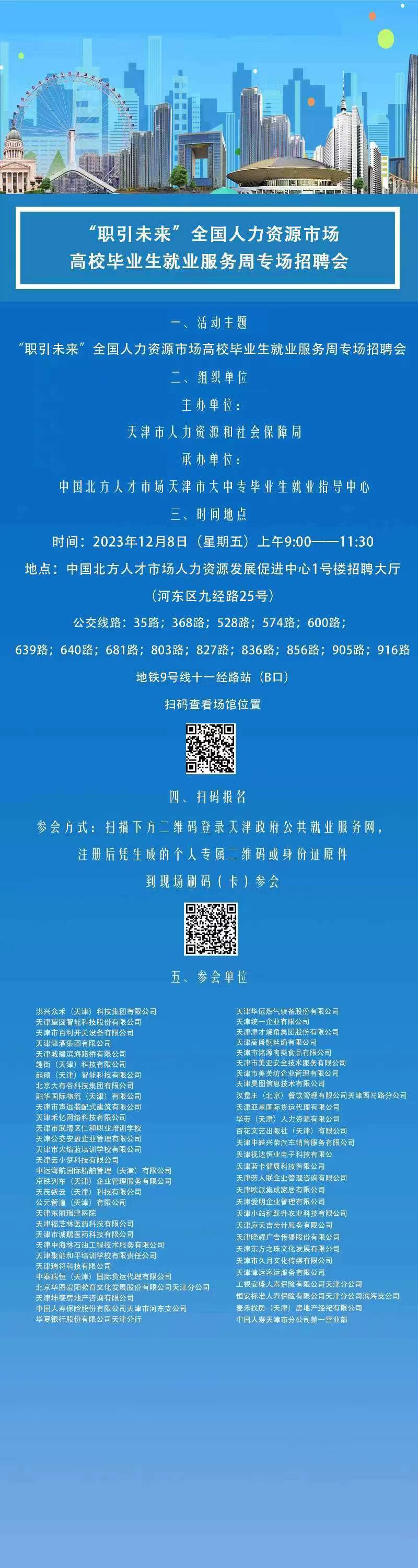 明日(12月8日)上午天津市大中专毕业生就业指导中心将在市人力资源发展促进中心(河东区九经路25号)举办毕业生专场招聘会。
